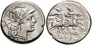 | Cabeça romana com um elmo. | Dióscuros a cavalo; sobre CN • DO; ROMA como lema. |