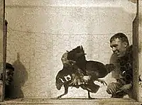 Uma câmera estacionária observa dois galos de briga em uma plataforma elevada, com uma cerca de arame por trás. Do outro lado da grade estão dois homens, um e cada lado do quadro. Vemos apenas a cabeça do homem à nossa esquerda e a cabeça e o peito do homem à nossa direita, que está claramente no comando. O dinheiro muda de mãos duas vezes enquanto os bichos lutam e penas voam. O homem à direita aponta e sacode o dedo. Ambos os galos ainda estão de pé quando o filme termina.