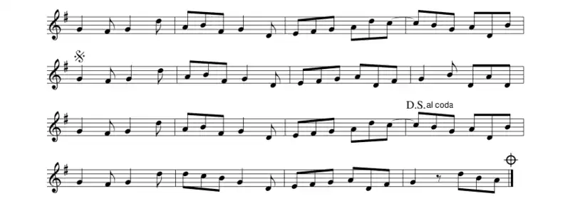 No caso da figura acima, a música deve ser executada até chegar em "D.S. al Coda", voltar até o símbolo "Segno" e então tocar a música até o último compasso, onde se encontra a figura "Coda".