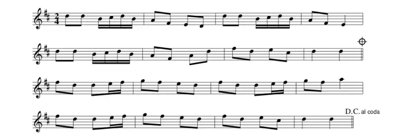 No caso da figura acima, a música deve ser executada até o último compasso, onde está a indicação "D.C al Coda", voltar ao início da música e continuar a execução da peça até encontrar o símbolo "Coda", finalizando a execução.