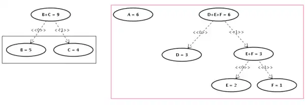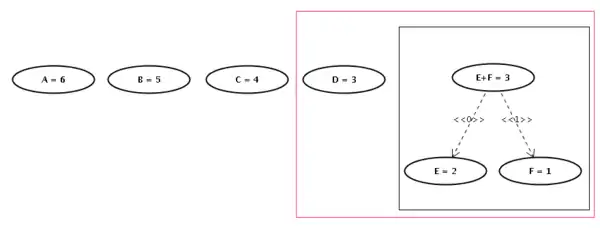Vemos nessa segunda imagem, em preto, os nós E e F unidos num nó que chamamos de E+F, e que tem o peso igual à soma dos nós E e F. Este novo nó é inserido no conjunto de nós dos quais escolheremos os próximos nós a serem unidos. Coincidentemente, neste exemplo, os próximos nós são este novo nó E+F e o nó D, como vemos na próxima figura: