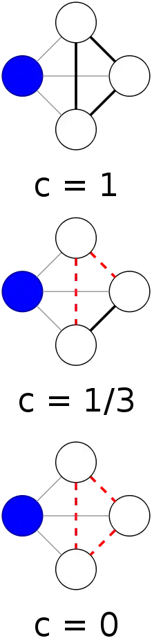 Estas medidas oscilam entre 1, no caso de todos os vizinhos de vi estarem conectados com todos os outros vértices da vizinhança, e 0 se nenhum dos vértices conectados a vi estiver conectado com qualquer outro vértice conectado a vi.
