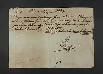 ![]() Bilhete solicitando o banguê para Elias de Nação Nagô. Transcrição: Rua do Bispo, N. 43. Casa onde mora o Cônego João Mariano de Campos Lima, faleceu um seu escravo carregador de cadeira por nome Elias de Nação Nagô de uma constipação. Bahia, 14 de Maio de 1835. Cônego João Mariano de Campos Lima[1] | |