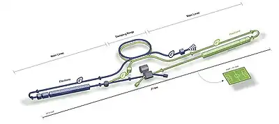 Dos anéis de amortecimento, os feixes de partículas serão enviados para os linacs principais de radiofrequência supercondutores , cada 11 km de comprimento, onde serão acelerados para 250 GeV. Neste nível de energia, cada raio terá uma potência média de cerca de 5,3 megawatts. Cinco trens de feixes serão produzidos e acelerados por segundo.