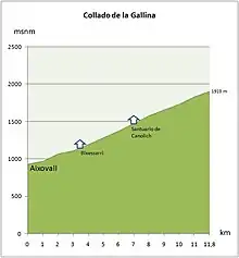 O Collado de la Gallina (1907 msnm) tem duas vertentes desde Sant Julià de Lòria (903 msnm): a norte através de Bixessarri e a sul por Fontaneda.[5]