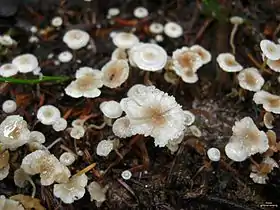 O píleo é convexo quando jovem e, posteriormente, torna-se convexo a achatado ou ligeiramente deprimido no centro, atingindo um diâmetro de 3 a 11 milímetros. A margem do píleo começa enrolada ou curvada para dentro, mas se endireita conforme o amadurecimento do fungo; a superfície do mesmo varia de seca a úmida, lisa a coberta com finos cabelos esbranquiçados e contém sulcos radiais translúcidos na margem. O fungo também apresenta sub-higrofaneidade, obtendo uma coloração laranja-acinzentada quando aguado ou na fase idosa, e geralmente é branco com um fraco rubor rosado quando fresco. A carne, por sua vez, é esbranquiçada, muito fina e não tem sabor ou odor característico. As lamelas são adnatas a arqueadas ligeiramente (curvadas na forma de um arco) com um dente (o que significa que as lamelas se curvam para se juntarem ao estipe, mas então, muito próximo deste, a borda das lamelas se curva novamente).[17] Existem entre 12 e 20 lamelas que se estendem completamente desde a borda do píleo até o estipe, e de três a cinco camadas de lamélulas (lamelas mais curtas que não se estendem completamente até o estipe).[7] Em geral, elas são finas, estreitas a moderadamente largas e com uma coloração branca a rosada. As bordas branquiais são uniformes e de mesma cor das faces.[18]