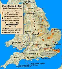 Os cemitérios mais antigos que podem ser classificados como anglo-saxões são encontrados em regiões muito distintas e são datados do início do século V.[133] A exceção é Kent, onde a densidade de cemitérios e artefatos sugere um assentamento anglo-saxão excepcionalmente pesado, ou um assentamento contínuo que começou em uma data anterior, ou ambos. No final do século V, havia outros cemitérios anglo-saxões, alguns deles adjacentes a outros mais antigos, mas com uma grande expansão em outras áreas, incluindo agora a costa sul de Sussex.[134]
