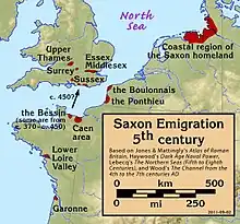Gildas usou o termo romano tardio correto para os saxões, foederati, pessoas que chegaram à Grã-Bretanha por meio de um sistema de tratado bem utilizado. Esse tipo de tratado havia sido usado em outros lugares para trazer pessoas para o Império Romano para se deslocarem pelas estradas ou rios e trabalharem ao lado do exército.[24] Gildas os chamou de saxões, que provavelmente era o termo britânico comum para os colonos. O uso da palavra patria por Gildas,[25][lower-alpha 6] quando usada em relação aos saxões e pictos, deu a impressão de que alguns saxões poderiam ser considerados nativos da Britânia.[26]