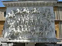 A figura masculina à esquerda, segurando um obelisco, é uma personificação do Campo de Marte. Augusto havia colocado seu obelisco ali como relógio de sol e ali era o local das cerimônias de deificação imperial. A figura feminina à direita, de armadura e saudando o casal imperial, é uma personificação de Roma e seu escudo está decorado com os lendários fundadores de Roma, Rômulo e Remo, sendo amamentados por uma loba.