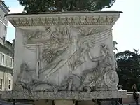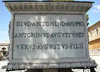 Um dos lados da base traz uma inscrição dedicatória (CIL VI, 1004), dois outros relatam o decursio funerário (uma cerimônia realizada pela cavalaria romana) e o último mostra a apoteose, a ascensão aos céus, do imperador e sua esposa Faustina.