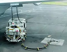 O combustível de aviação é transferido para a aeronave via dois métodos: debaixo da asa ou sobre a asa. O abastecimento ocorrido debaixo da asa, é conhecido como ponto-simples, é usado para aeronaves grandes ou para combustível de jatos exclusivamente. O abastecimento ocorrido sobre da asa é usado em pequenos aviões, helicópteros e toda aeronave de motor a pistão. O abastecimento ocorrido sobre a asa é similar ao abastecimento automobilístico – uma ou mais mangueiras de combustível são colocadas no avião igual a uma bomba de combustível convencional. Para este tipo de abastecimento, uma mangueira de alta pressão é conectada e o combustível é enchido até chegar a 50 PSI. Neste tipo de distribuição de combustível entre tanques é automatizada ou controlada por um painel de controle localizado no cockpit da aeronave.