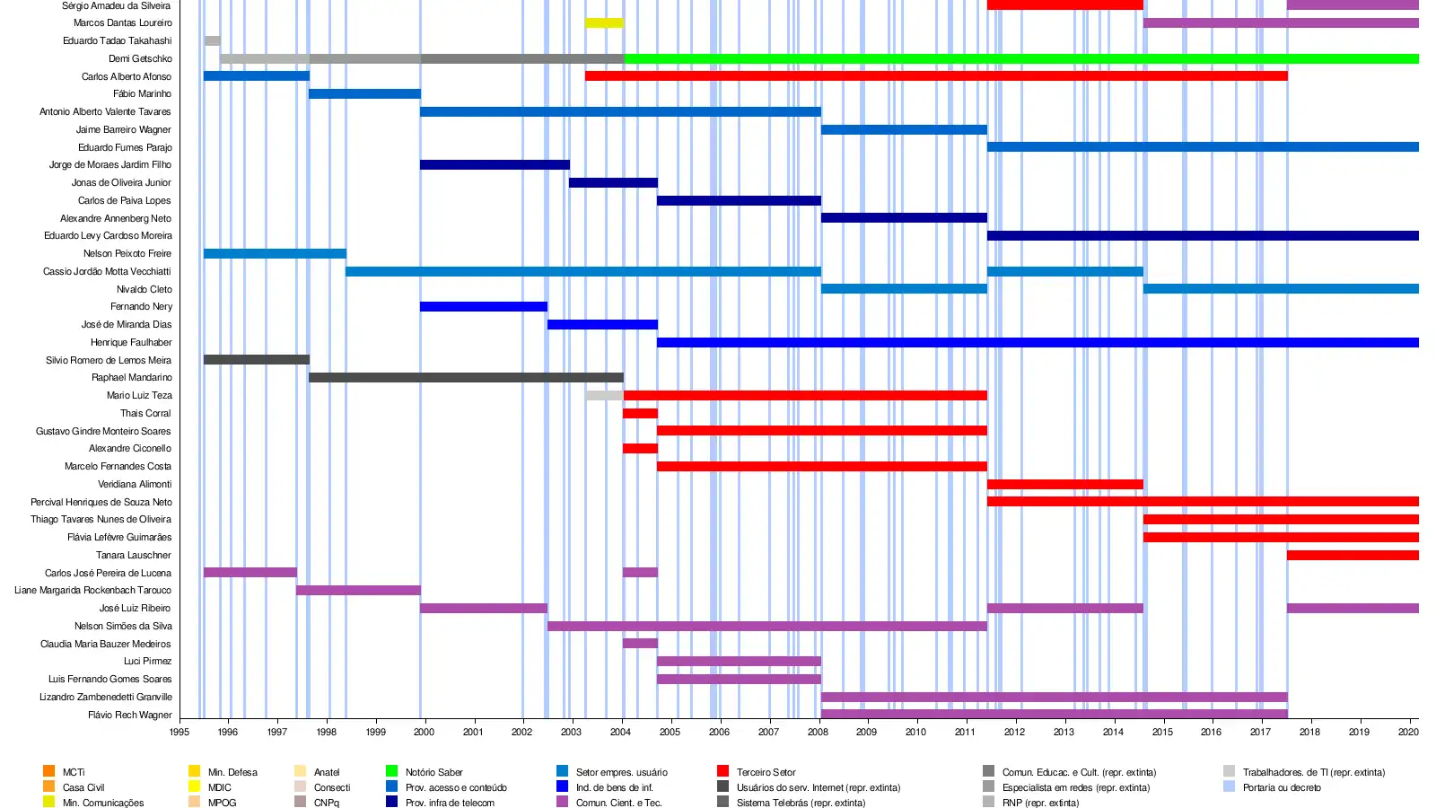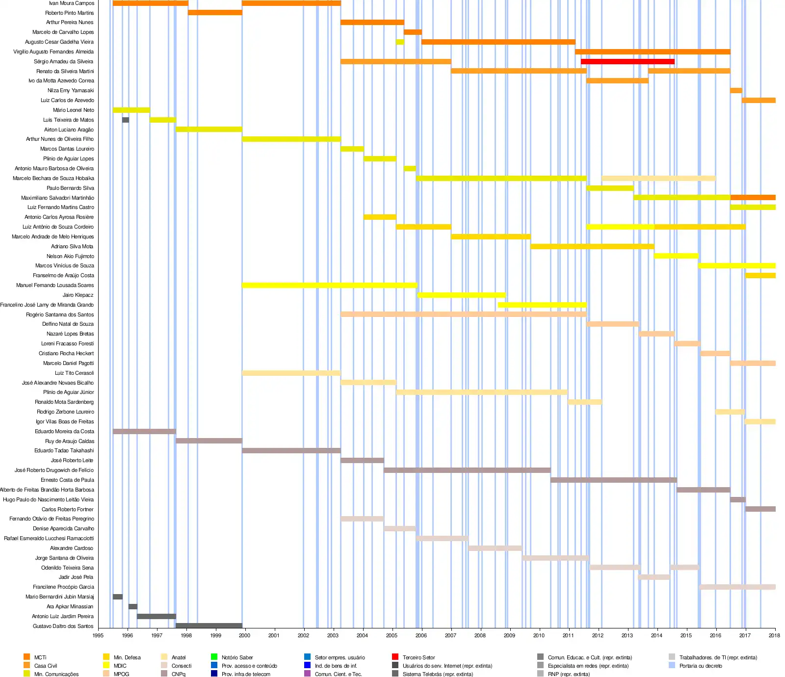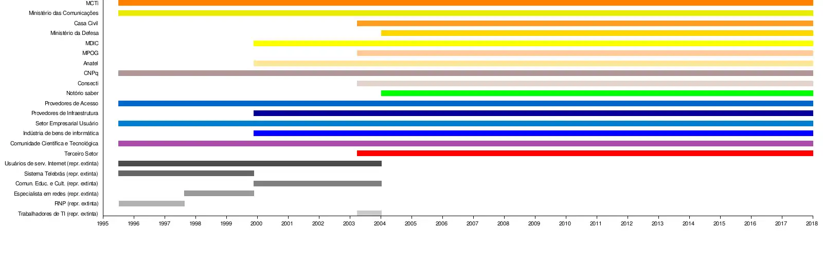 Desde a publicação da Medida Provisória nº 782, de 31 de maio de 2017, posteriormente convertida na Lei Federal nº 13.502, de 1º de novembro de 2017, houve uma fusão entre o Ministério da Comunicação e o Ministério da Ciência e Tecnologia, a qual originou o Ministério da Ciência, Tecnologia, Inovações e Comunicações (MCTIC). Assim, embora o Decreto Federal nº 4.829 não tenha sido atualizado após a medida provisória, na prática houve uma concentração da representação do MCTIC. Nesse sentido, as representações atualmente são da seguinte maneira: