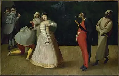- Zanni: servos, palhaços; personagens como Arlecchino, Brighella, Scapino, Pulcinella e Pedrolino[16]