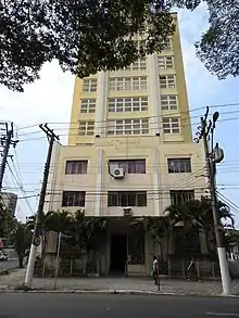 O edifício foi construído em 1945, e se utiliza da arquitetura art-deco (tudo indica que seja porem não é confirmado), em sua época de construção era um prédio bem diferenciado da arquitetura presente na cidade, com uma base em forma de trapézio e uma torre de 9 andares (sem contar a base) em forma retangular.