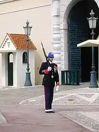 Um antecedente histórico dos guardas do Palácio era conhecida no século XIX como os "Papalins", ex soldados dos Estados Papais que, ao finalizar a autoridade temporária do Papado no momento da unificação italiana, foi dado um papel na proteção do Príncipe de Mônaco. Uma rua no distrito monegasco de Fontvieille leva o nome de "Papalins".