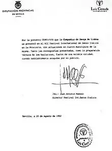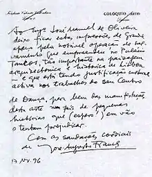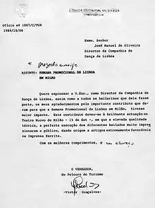 ![]() Carta enviada ao Engº José Manuel de Oliveira Em 1987/1988 a Companhia de Dança de Lisboa vai a caminho do novo espaço, Palácio dos Marqueses de Tancos(...) e a honra de lhe ter restituído o seu lugar na paisagem arquitetónica e cultural da cidade. Testemunho de José-Augusto França, após visita. |