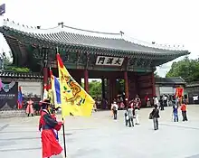 - Honghwamun (portão principal):O portão principal do palácio está voltado para o leste, como a parte central do palácio. Construído pela primeira vez em 1484, queimou durante a invasão japonesa de 1592 e foi reconstruído em 1616. Um pavilhão de bolas (sipjagak) foi construído em cada lado deste portão de madeira de duas camadas. Conforme você passa pelo portão, a Ponte Okcheongyo aparece. Entre os arcos sob o parapeito da ponte estão goblins esculpidos (dokkaebi) que têm como objetivo afastar os maus espíritos. A ponte Okcheongyo foi construída há aproximadamente 500 anos e serve como uma entrada simbólica para o pátio. Honghwamun foi designado Tesouro Nacional 384.