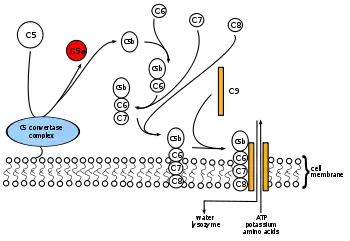 O complexo de ataque a membrana é iniciado quando a proteína do complemento C5 convertase cliva C5 em C5a e C5b.