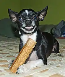 - Expressão Facial: Os gestos faciais desempenham um papel importante na comunicação animal. Muitas vezes, um gesto facial é um sinal de emoção. Os cães, por exemplo, expressam raiva por grunhidos e mostrando os dentes. Em alarme, seus ouvidos levantam, com medo, os ouvidos se abaixam enquanto os cães expõem os dentes levemente e estalam os olhos. Jeffrey Mogil estudou as expressões faciais dos ratos durante incrementos de dor crescente; Havia cinco expressões faciais reconhecíveis; Aperto orbital, protuberância no nariz e bochecha e mudanças no transporte de orelha e bigodes.[3]