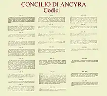 Realizado em 314, foi um sínodo plenário ortodoxo. O ano pode ser seguramente inferido pelo fato de os primeiro nove cânones foram dedicados a reparar o estrago provocado na igreja pelas perseguições, que cessaram logo após a queda de Maximino Daia em 313 dC.[1]