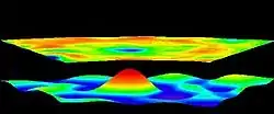 Topografia —acima— e campo gravitacional —abaixo— da concentração de massa correspondente ao Mare Serenitatis, na Lua (Lunar Prospector, NASA).