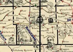 Pormenor do mapa pictórico "Galbraith's 1897 Rail Service Map of Iowa", que mostra as localidades do condado de Buchanan à época. Algumas localidades foram movidas do seu local correto para colocar as figuras. Diversas localidades, como Hamerville, Vista, Kier, Middlefield, Newtonville e Castleville não existem hoje, sendo meras cidades-fantasmas.