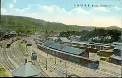 Postal ilustrando o caminho-de-ferro de Boston e Maine em Keene, condado de Cheshire, Nova Hampshire, c. 1916