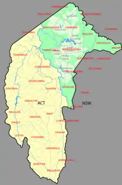 - Quase toda a Paróquia de Weetangera torna-se parte da ACT, exceto para a pequena seção perto Ginninderra cai na 🌍