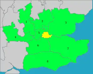 Condados históricos que rodeiam Londres, dentro das fronteiras de 1889. 1. Buckinghamshire, 2. Hertfordshire, 3. Essex, 4. Berkshire, 5. Middlesex, 6. Surrey, 7. Kent, 8. Sussex e Condado de Londres (yellow). Middlesex já não existe como condado, estando integrado na Grande Londres, a qual cobre uma área muito maior que o histórico Condado de Londres mostrado aqui.