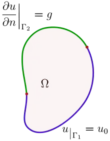 Por exemple, se u é uma solução para uma equação diferencial parcial em um conjunto Ω com contorno de trecho suave ∂Ω, e ∂Ω é dividido em duas partes, Γ₁ e Γ₂, um pode usar uma condição de contorno de Dirichlet em Γ₁ e uma condição de contorno de Neumann em Γ₂: