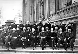 Sentados, da esquerda para a direita: William McCrea, Jan Hendrik Oort, Georges Lemaître, Gorter, Wolfgang Pauli, William Lawrence Bragg (presidente), Robert Oppenheimer, Moller, Harlow Shapley, Otto Heckmann;