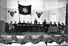 Presidium e secretariado da Conferência de Vilnius. A sala foi decorada com pequenas bandeiras de duas cores (vermelho e verde) (três estão visíveis na imagem). Esta foi uma das sugestões para a Bandeira da Lituânia. Os delegados decidiram que ela era muito escura e obscura e eventualmente uma listra amarela foi adicionada.[1]