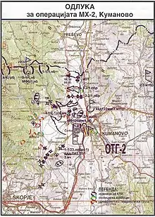 No mesmo dia, o conselho de segurança macedónio decidiu empreender uma nova ofensiva contra o NLA para expulsá-los dos seus redutos nas aldeias a norte de Kumanovo. [93] As pessoas nas aldeias controladas pelo NLA tiveram até às 15h00 para evacuarem antes que as forças de segurança macedónias lançassem a sua ofensiva. O porta-voz do Exército, Gjordji Trendafilov, disse à Associated Press que o NLA mantinha milhares de aldeões como escudos humanos. [94] A ofensiva começou com o bombardeio de alvos selecionados em Vaksince por helicópteros militares e artilharia de campanha.