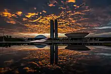 Como a maioria das construções oficiais brasilienses, o edifício do Congresso foi concebido por Oscar Niemeyer com projeto estrutural do engenheiro Joaquim Cardozo, e segue o estilo da arquitetura moderna brasileira. A semiesfera à esquerda é o assento do Senado, e a semiesfera à direita é o assento da câmara dos deputados. Entre eles há duas torres dos escritórios. O congresso ocupa também outros edifícios vizinhos, alguns deles interconectados por um túnel.[18]