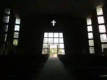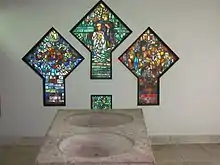 Quanto ao batistério, localizado entre a paróquia e a torre, foi projetado pelo arquiteto. Seguindo a ideia de unidade, a pia batismal é um bloco de granito trabalhado. Em cima da pia, os vitrais de autoria de Yolanda Mohaliy estão ligados com a simbologia do lugar e são ensinamentos do processo de batismo.[11]
