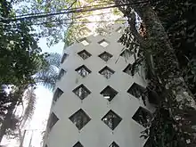 A torre, separada do corpo da Igreja, também tem referências modernas. A silhueta esguia do bloco de concreto quadrado de 34 metros com cantos arrendondados, é vazado em nichos losangulares alinhados para formarem um padrão xadrez. [2]