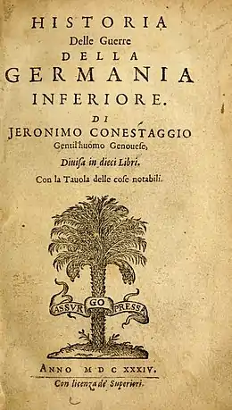 - Historia delle guerre della Germania inferiore, istoria di Ieronimo Conestaggio... Parte prima. Diuisa in dieci libri, In Venetia: appresso Antonio Pinelli, 1614 (In Google libri: Leyden: Elziver, 1634)
