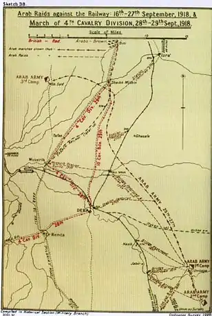 Quando as tropas que restavam do 4.º Exército Otomano retiravam para norte via Dara foram perseguidas ao longo de «muitas milhas sem água» por tropas árabes que se «juntaram à força de Faiçal com consequências horríficas».[25][26] Três quartos do exército de 4 000 homens de Faiçal, incluindo a unidade de camelos de Nuri esh Shalaan, eram irregulares. Na noite de 26 para 27 de setembro fizeram uma marcha forçada, cruzando a linha de comboio a norte de Dara, a que arrancaram carris, e chegaram a Sheikh Sa'd, 24 km a noroeste de Dara, na madrugada do dia 27. O líder xeque beduíno Auda abu Tai, da tribo Howaytat, capturou um comboio e 200 prisioneiros na estação de Gazale. Por sua vez, Talal, o neto do rei do Hejaz Huceine ibne Ali, tomou Izra, alguns quilómetros mais a norte. Foram feitos 2 000 prisioneiros entre o meio-dia de 26 de setembro e o meio-dia de 27 de setembro, quando os Anaza, uma confederação tribal árabe, atacou a retaguarda otomana que defendia Dara. Os combates prosseguiram até meio da noite.[27]