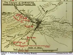 Damasco foi capturada quando o Corpo Montado do Deserto (Desert Mounted Corps) britânico e o exército xarifal do Hejaz do príncipe Faiçal cercaram a cidade, depois de uma perseguição a cavalo em direção a norte ao longo das duas estradas principais para Damasco. Durante essa perseguição, foram atacados e capturados muitos postos de defesa da retaguarda estabelecidos pelo que restava do 4.º, 7.º e 8.º exércitos otomanos. O êxito militar em Damasco foi explorado politicamente por representantes da França, Reino Unido e da Revolta Árabe.