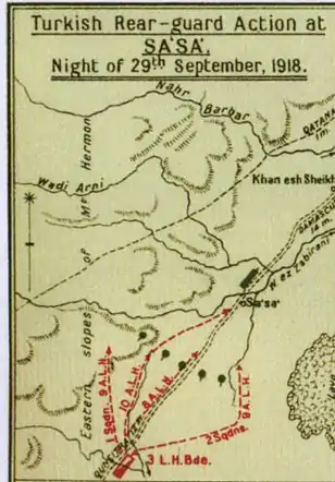 A 3.ª Brigada de Cavalaria Ligeira avançou para norte ao longo da margem ocidental do Jordão até chegar à margem sul do lago de Hula, procurando um local onde pudesse atravessar o rio.[59][61] Um esquadrão do 10.º Regimento cruzou o rio ao pôr do sol e tomou uma posição fortificada da retaguarda inimiga, capturando 50 prisioneiros e três peças de artilharia. À meia-noite, a brigada tinha cruzado o rio tinha avançado 6,5 km, cortando a estrada para Damasco em Deir es Saras, mas a força de retaguarda principal otomana já tinha retirado.[62]