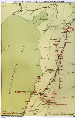 A 7.ª (Meerut) Divisão do Exército da Índia Britânica só saiu de Haifa no dia em que Damasco foi tomada, a 1 de outubro. As tropas da vanguarda britânica chegaram a Beirute no dia 8 de outubro.[16][17]