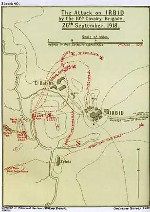 No fim da tarde de 26 de setembro, a 10.ª Brigada de Cavalaria foi atacada pela guarda do flanco do 4.º Exército otomano, que defendia fortemente os campos em volta de Irbid. Estas tropas otomanas tinham sido a guarnição de Amã (à exceção da sua retaguarda, que tinha sido capturada durante a tomada daquela cidade) e como não tinham estado em combates intensos[lower-alpha 2][34] «ainda estavam intactas como força de combate, apesar de estarem em retirada rápida».[18]