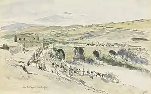 Ontem fui a Haifa e ao Monte Carmelo. A vista desde o Monte Carmelo para a baía é adorável; muito parecida com a baía de Nápoles — sem o Vesúvio e Capri. A baía está rodeada por montanhas exceto onde o rio Quisom corre desde o vale de Esdrelão. No monte Carmelo está o Mosteiro Carmelita [...] Perto encontra-se um canhão longo alemão, de grande calibre, que domina a baía e o vale. Disparou alguns tiros sobre as nossas tropas, creio, e sobre dois contratorpedeiros que cooperavam na costa; mas não fez estragos. O monte Carmelo é uma massa enorme de montanhas rochosas; outrora coberto de árvores [...] Haifa é uma cidade grande, bem construída, entre a montanha e a ponta sul da baía. Tenho uma villa fixa confortável para mim, se formos lá. Tenho o caminho de ferro turco a funcionar, agora, daqui [Haifa] até Beisan e à ponte do Jordão imediatamente a sul do lago Tiberíades. Contudo, não me vai ajudar muito a sul de Haifa; pois tenho muito pouco material circulante para ele e as subidas são demasiado íngremes para transportar grandes cargas. |