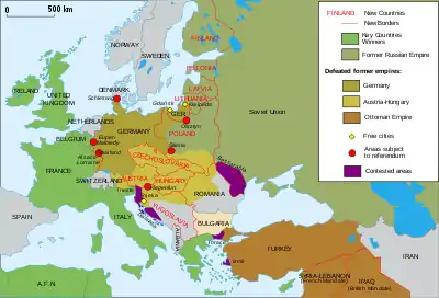 Após 123 anos, a Polônia ressurgiu como um país independente. O Reino da Sérvia e sua dinastia, como uma "nação menor da Entente" e o país com o maior número de vítimas per capita, [13] [14] [15] tornou-se a espinha dorsal de um novo estado multinacional, o Reino dos Sérvios, Croatas e Eslovenos, mais tarde renomeados como Iugoslávia. A Tchecoslováquia, combinando o Reino da Boémia com partes do Reino da Hungria, tornou-se uma nova nação. A Romênia uniria todos os povos de língua romena sob um único estado que conduziria à Grande Romênia. [16] A Rússia tornou-se a União Soviética e perdeu a Finlândia, a Estônia, a Lituânia e a Letônia, que se tornaram países independentes. O Império Otomano foi logo substituído pela Turquia e muitos dos seus territórios tornaram-se mandatos sob domínio britânico ou francês.