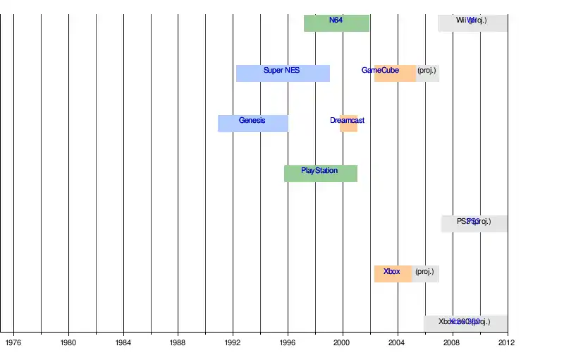 - Sega: tradicional fabricante de arcades, começou no Japão com as consolas SG-1000, SG-1000 Mark II e SC-3000. Teve grande sucesso com a Master System e a Mega Drive. Mas com o grande número de periféricos da Mega Drive, o fracasso da Saturn nos EUA, mesmo com o relativo sucesso do Dreamcast (o primeiro console 128-bit) no mundo, veio a falência devido a concorrência do PlayStation da Sony e outros seguintes fatores: o PlayStation, segundo os programadores de jogos, era muito mais fácil para se programar em 3D, uma vez que o Saturn possuía 3 processadores e, dizem, era dificílimo criar jogos em três dimensões para ele. Os jogos 3D seriam algo que revolucionária os videojogos — porém naquela época eram incipientes. Desse modo, alguns dos melhores jogos 2D de sua geração são para Saturn. Entretanto, desnecessário dizer, o que determinou o mercado foram os poligonais 3D, sendo que o PlayStation criou excelentes jogos tridimensionais e desbancou o Saturn rapidamente. Além da Nintendo, que em 1996 veio com o seu Nintendo 64 que trabalhava com 64 bits, tornando-se assim um console melhor do que o PlayStation e consequentemente, que o Sega Saturn. Os jogos poligonais para Saturn eram sofríveis com adaptações dos arcades como o jogo Virtua Fighter. Quanto ao Dreamcast: embora dona de um dos melhores videogames de sua geração, a Sega não conseguiu mais se estabilizar financeiramente, pois os prejuízos deixados pelo Saturn e a montanha de periféricos para o Mega Drive nunca foram saneados. Desse modo, a Sega passou a dedicar-se apenas a produção de softwares a partir de 2001.