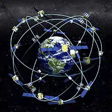 ![]() Representação da constelação de satélites do sistema GPS, com 24 satélites distribuídos em seis planos orbitais.. | |