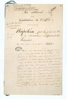 Napoleão, tendo retornado da Ilha de Elba para os Cem Dias, não foi capaz de restabelecer o Primeiro Império como era antes de sua restauração. Ele pediu ao liberal Benjamin Constant que preparasse uma nova Constituição. Foi adotado por um plebiscito em 1º de junho de 1815 por uma imensa maioria dos cinco milhões de eleitores, embora um grande número de eleitores elegíveis se abstivesse. Foi promulgado na cerimônia no Champ de Mars. A rápida queda de Napoleão impediu que ela fosse totalmente aplicada.[1]