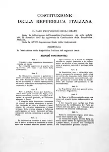 A Constituição da República Italiana (em italiano: Costituzione della Repubblica Italiana) foi promulgada pela Assembleia Constituinte em 22 de dezembro de 1947,[1] com 453 votos a favor e 62 contra. O texto, que já foi alterado 13 vezes, foi promulgado na edição extraordinária do Gazzetta Ufficiale n. 298 em 27 de dezembro de 1947.[1] A Assembleia Constituinte foi eleita por sufrágio universal em 2 de junho de 1946, ao mesmo tempo como um referendo sobre a abolição da monarquia. A constituição entrou em vigor em 1 de janeiro de 1948, um século após o Statuto Albertino ter sido promulgado. Embora este tenha permanecido em vigor após a Marcha sobre Roma de 1922, tornou-se destituído de valor efetivo.