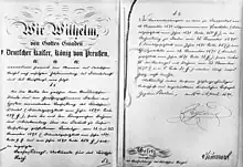 Primeira e última páginas da constituição de 1871, com a assinatura de Guilherme I da Alemanha, imperador da Alemanha e rei da Prússia