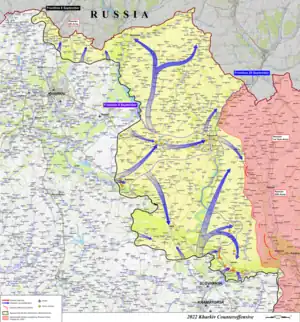 Em 9 de setembro, a Ucrânia rompeu as linhas russas, com os militares ucranianos dizendo que haviam avançado quase 50 quilômetros e recapturado mais de 1.000 quilômetros quadrados de território.[42] Este avanço os colocou a aproximadamente 44 quilômetros a noroeste de Izium,[43] a principal base logística russa na região,[44] uma taxa de avanço praticamente inédita desde que a Rússia se retirou de Quieve no início da guerra.[45] O Instituto para o Estudo da Guerra avaliou que as forças ucranianas capturaram aproximadamente 2.500 quilômetros quadrados no avanço.[46]